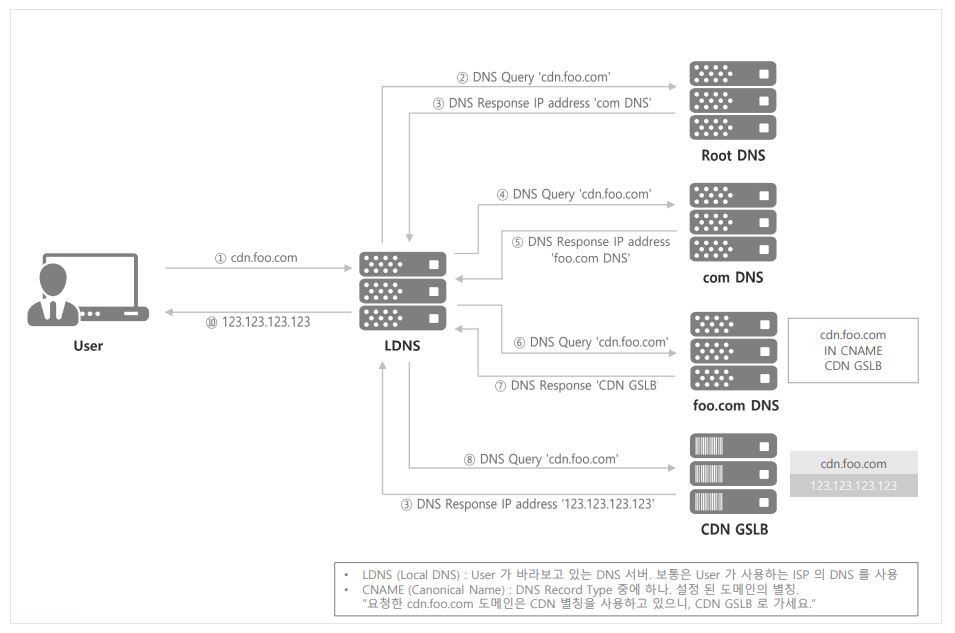 - 사용자가 Local DNS(LDNS) 통해서 DNS 요청 (컨텐츠 요청) - CDN에서 제공하는 LB로 바꿔주세요