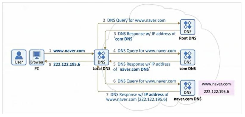 - 클라이언트(브라우저)에서 /etc/resolv.conf에 지정되어 있는 네임 서버로 www.naver.com에 대한 요청 전달