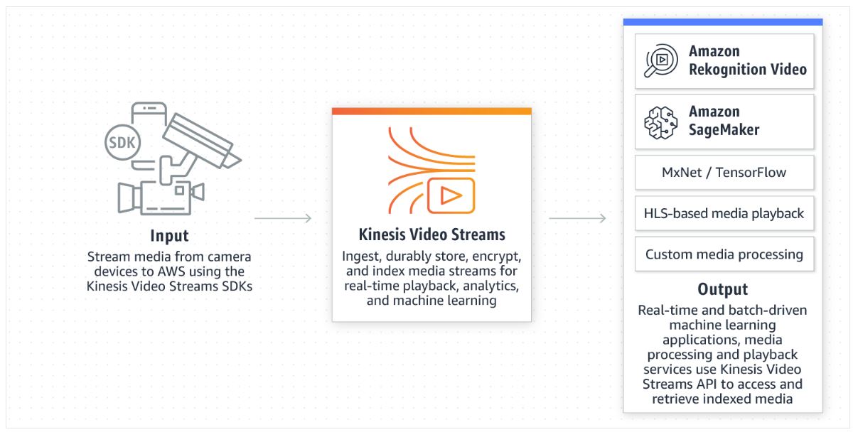 - 분석, 기계 학습(ML), 재생 및 기타 처리를 위해 연결된 장치에서 AWS로 비디오를 안전하게 스트리밍하는 완전 관리형 서비스