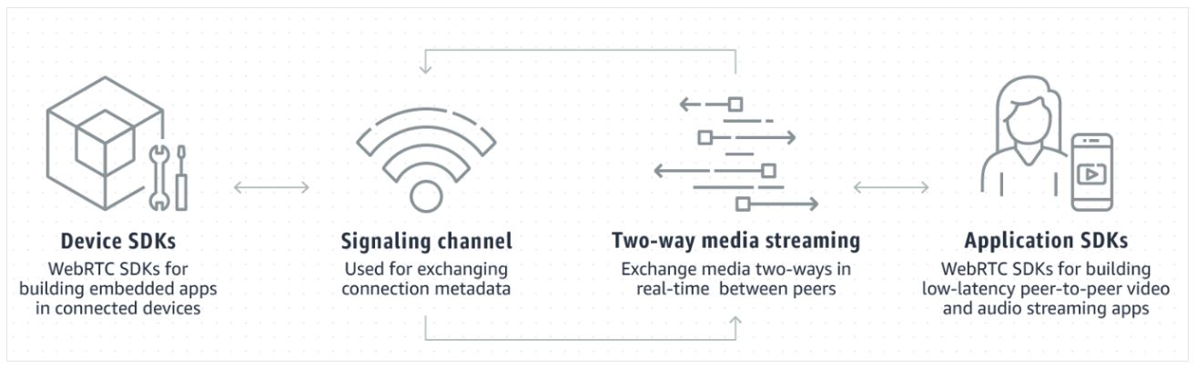 - 도어벨, 유아 모니터, 웹캠 및 가정용 감시 시스템과 같이 카메라가 장착된 홈 디바이스에서 AWS로 라이브 비디오와 오디오를 손쉽게 스트리밍 가능