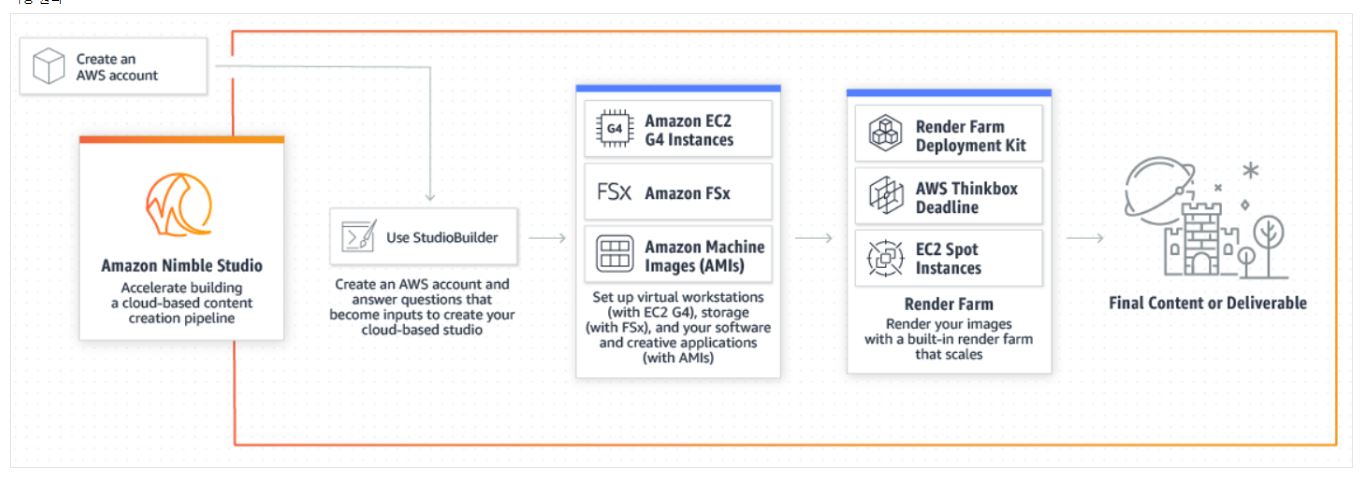 - AWS의 글로벌 인프라 전반에 걸쳐 가상 워크스테이션, 고속 스토리지 및 확장 가능한 렌더링에 액세스하여 전 세계 아티스트와 신속하게 온보딩 및 협업하고 콘텐츠를 더 빠르게 생성